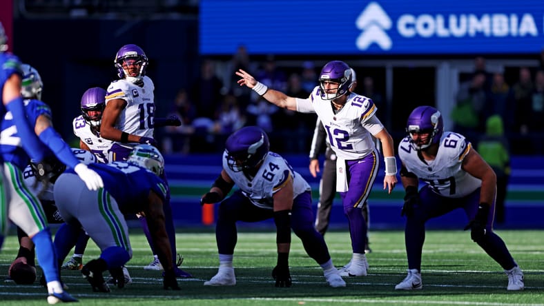 Nov 30, 2025; Seattle, Washington, USA; Minnesota Vikings quarterback Max Brosmer (12), protected by Justin Skule (67) and Blake Brandel (64), makes a call during the first half against the Seattle Seahawks at Lumen Field. Mandatory Credit: Kevin Ng-Imagn Images