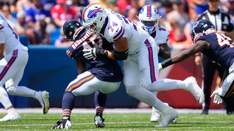 Aug 10, 2024; Orchard Park, New York, USA; Buffalo Bills offensive tackle Ryan Van Demark (74) blocks Chicago Bears linebacker Micah Baskerville (47) during the second half at Highmark Stadium. Mandatory Credit: Gregory Fisher-USA TODAY Sports