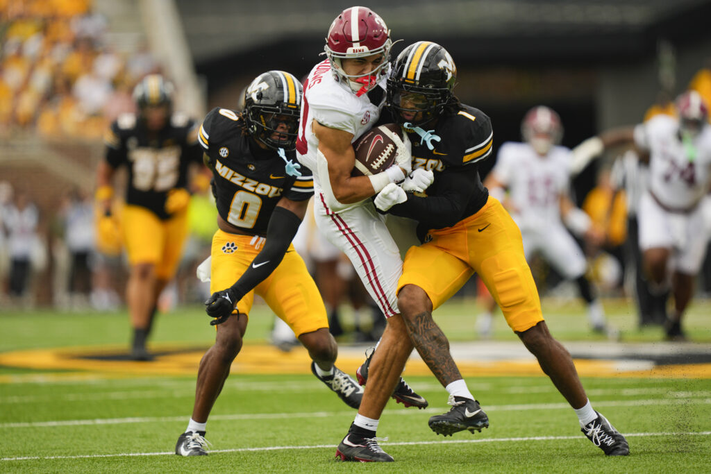 Oct 11, 2025; Columbia, Missouri, USA; Missouri Tigers safety Marvin Burks (1) injures Alabama Crimson Tide wide receiver Derek Meadows (30) and is ejected for targeting during the first half of the game at Faurot Field at Memorial Stadium. Mandatory Credit: Jay Biggerstaff-Imagn Images
