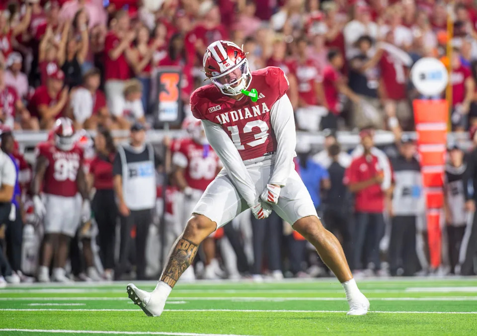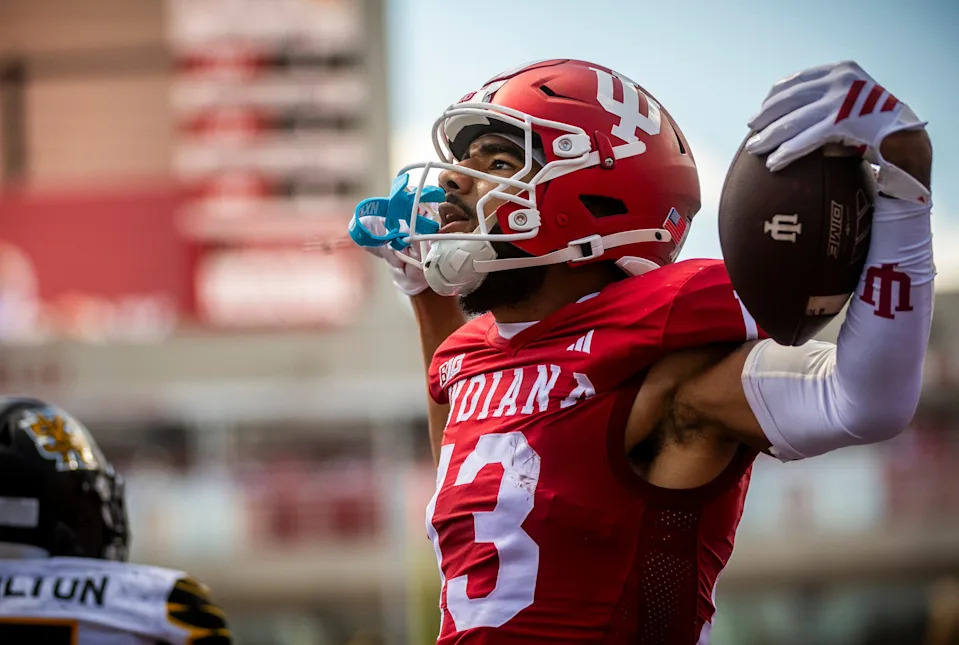 Indiana’s Elijah Sarratt (13) celebrates his touchdown during the Indiana versus Kennesaw State Big Ten football game at Memorial Stadium on Saturday, Sept. 6, 2025.