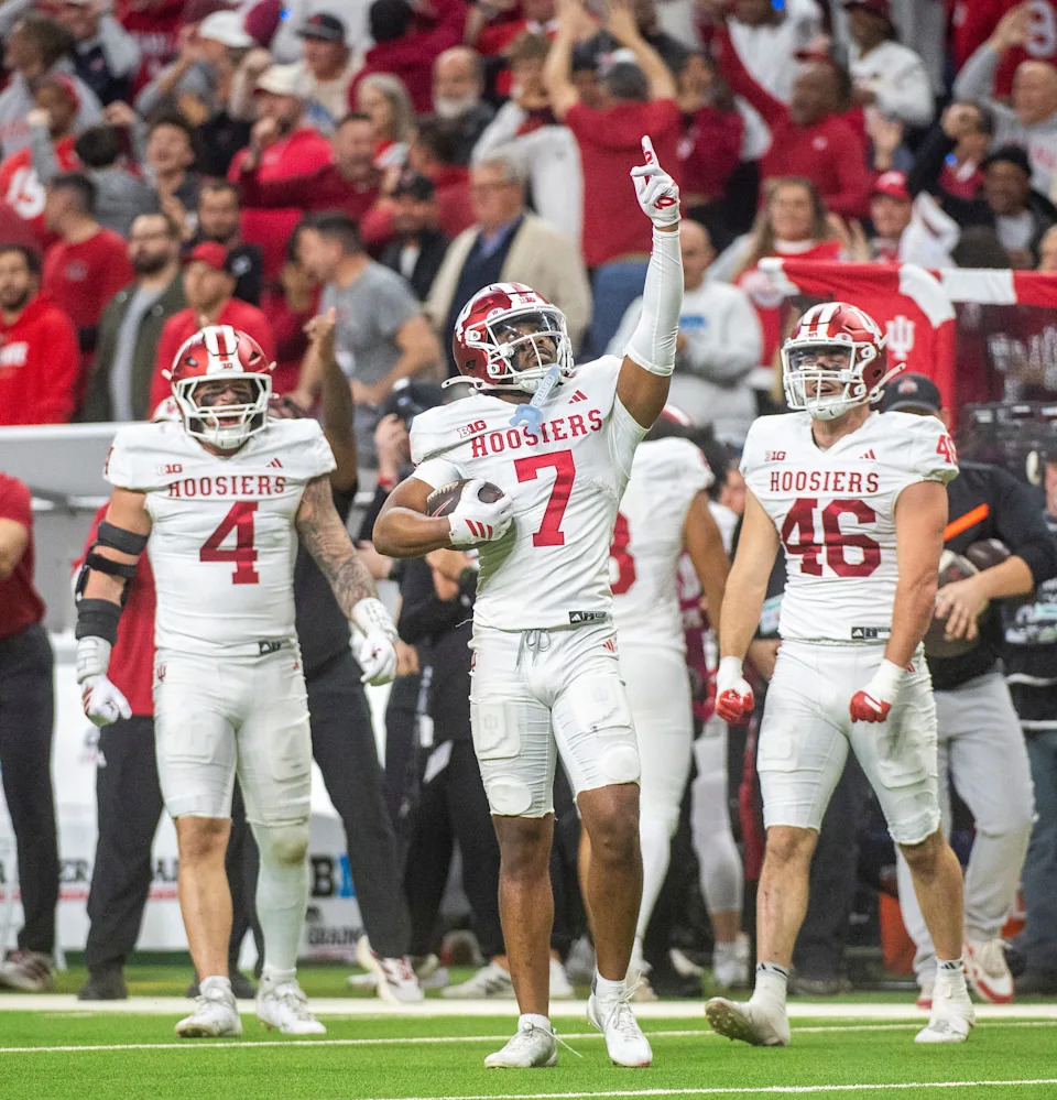 Indiana’s Louis Moore (7) celebrates with Aiden Fisher (4) and Isaiah Jones (46) after his interception during the Indiana versus Ohio State Big Ten Championship football game at Lucas Oil Stadium on Saturday, Dec. 6, 2025.