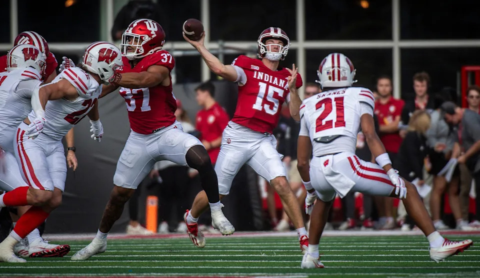 Indiana’s Fernando Mendoza (15) in the pocket during the Indiana versus Wisconsin football game at Memorial Stadium on Saturday, Nov. 15, 2025.