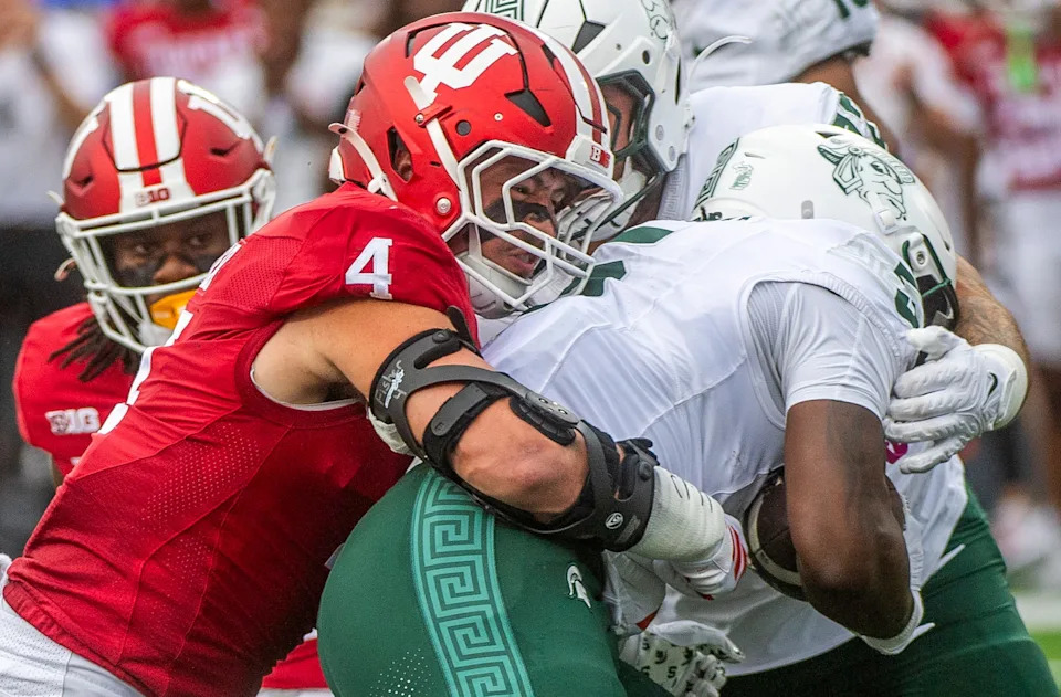 Indiana’s Aiden Fisher (4) tackles Michigan State’s Makhi Frazier (5) during the Indiana versus Michigan State football game at Memorial Stadium on Saturday, Oct. 18, 2025.