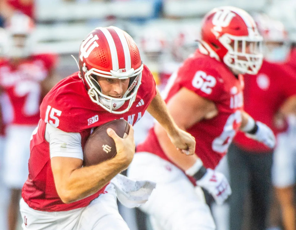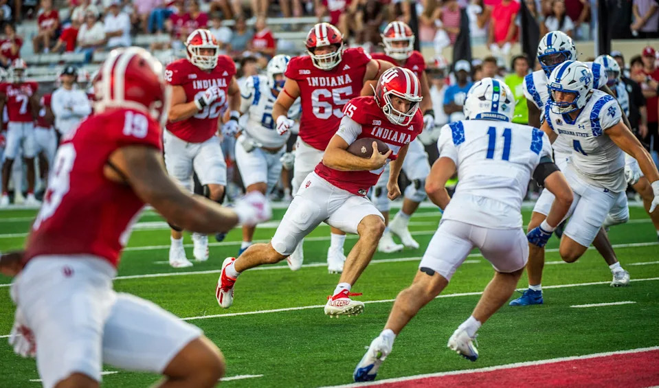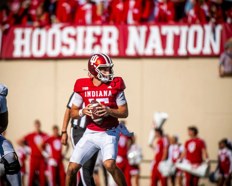 Indiana’s Fernando Medoza (15) during the Indiana versus Indiana State football game at Memorial Stadium on Friday, Sept. 12, 2025.
