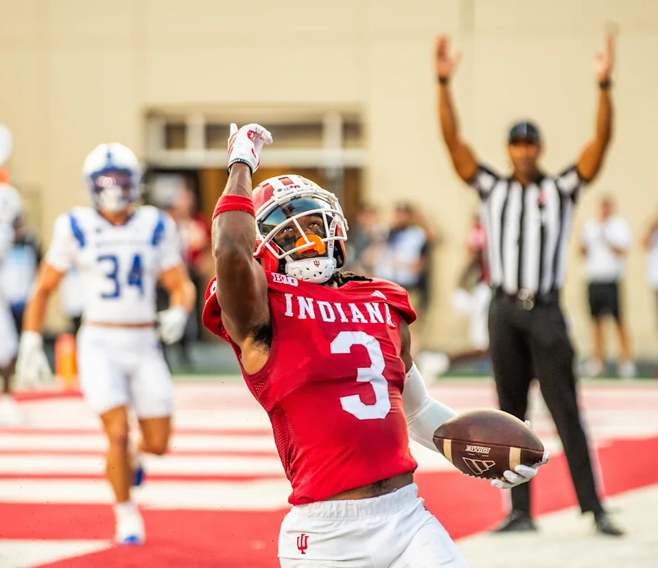 Indiana’s Omar Cooper Jr. (3) celebrates during the Indiana versus Old Dominion football game at Memorial Stadium on Saturday, Aug. 30, 2025.