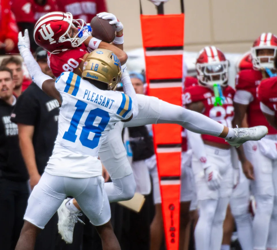 Indiana’s Charlie Becker (80) makes the catch during the Indiana versus UCLA football game at Memorial Stadium on Saturday, Oct. 25, 2025.