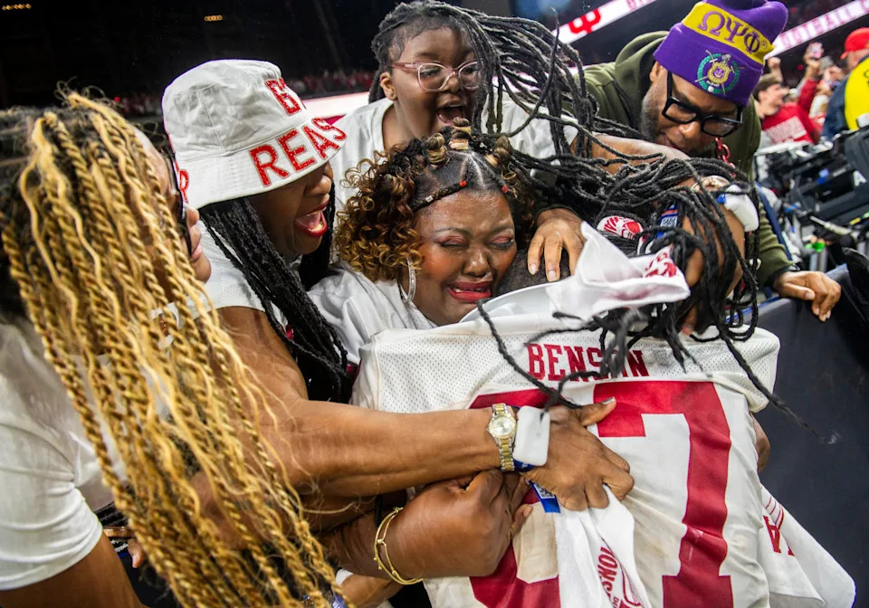 Indiana’s Kahlil Benson (67) and his family embrace and celebrate after the Indiana versus Ohio State Big Ten Championship football game at Lucas Oil Stadium on Saturday, Dec. 6, 2025.