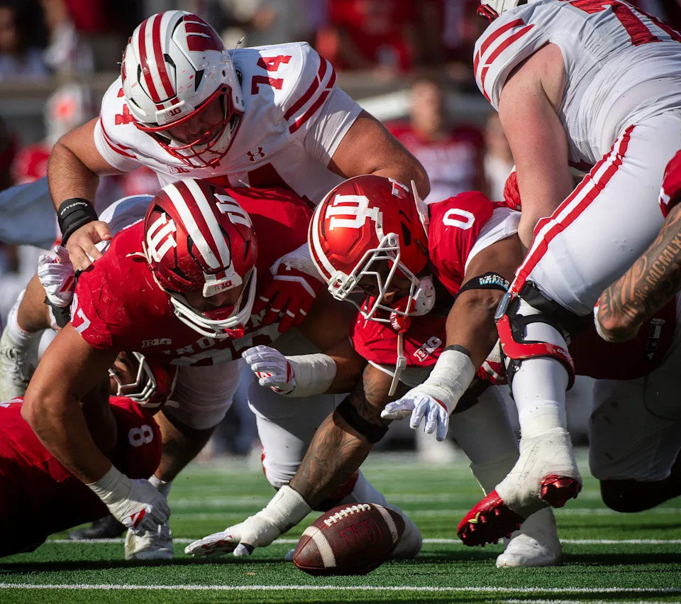 Indiana’s Hosea Wheeler (0) dives as he and Mario Landino (97) work to recover a fumble during the Indiana versus Wisconsin football game at Memorial Stadium on Saturday, Nov. 15, 2025.