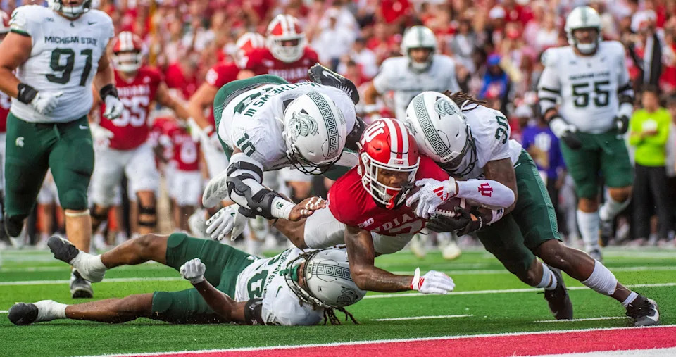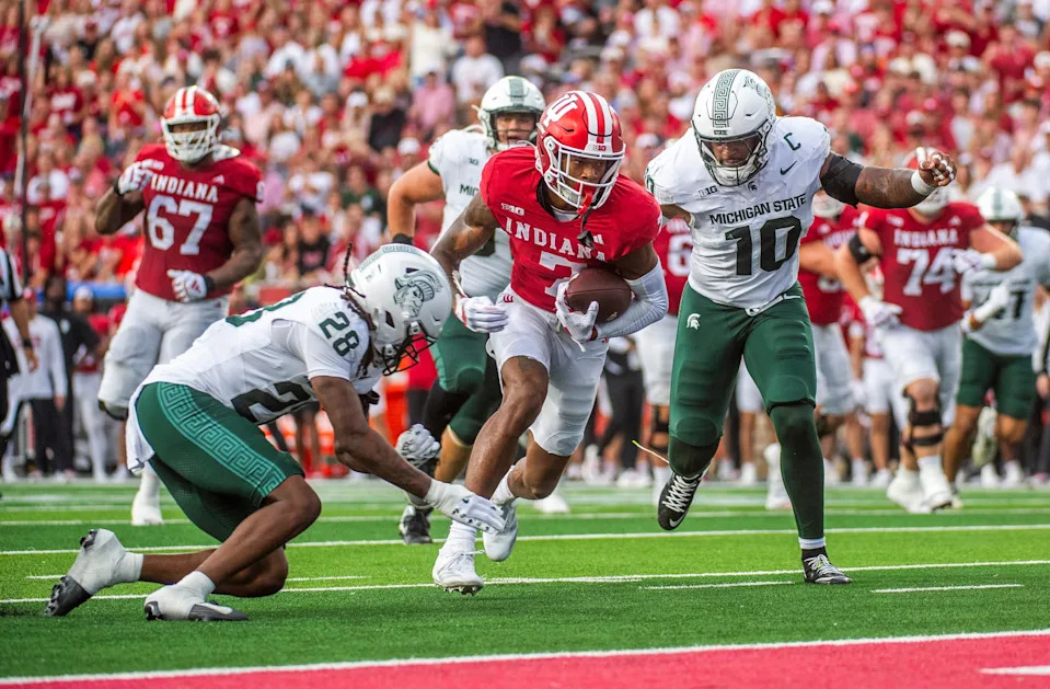 Indiana’s E.J. Williams Jr. (7) scores a touchdown during the Indiana versus Michigan State football game at Memorial Stadium on Saturday, Oct. 18, 2025.