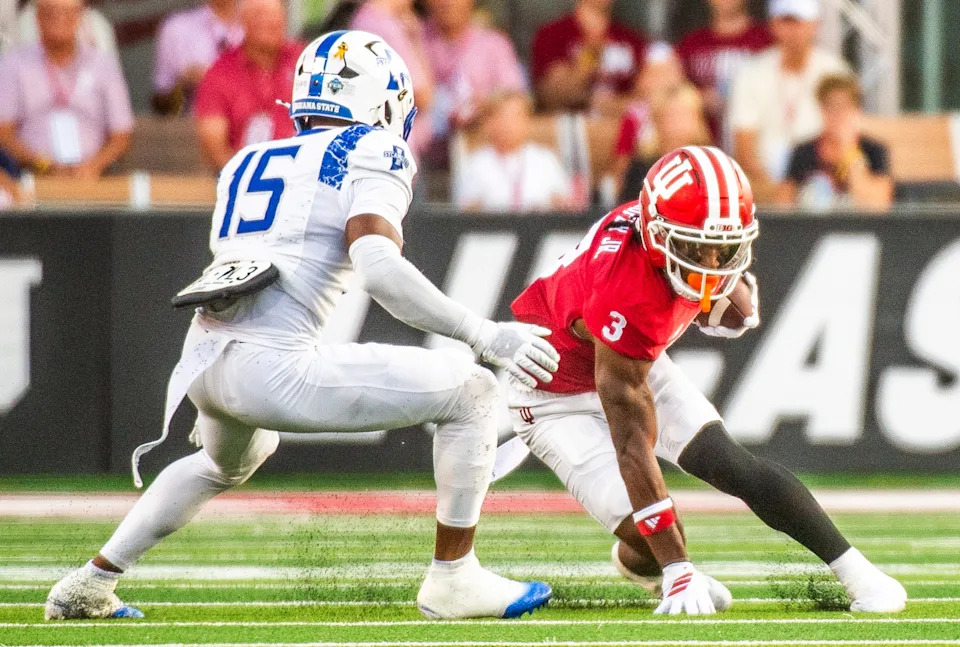 Indiana’s Omar Cooper Jr. (3) during the Indiana versus Indiana State football game at Memorial Stadium on Friday, Sept. 12, 2025.