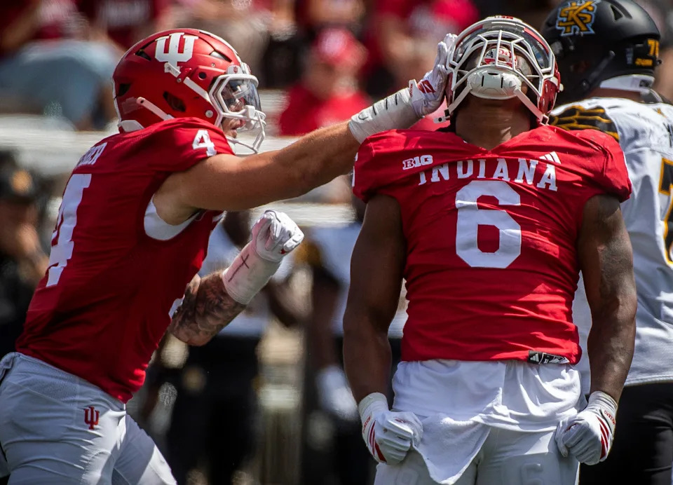 Indiana’s Mikail Kamara (6) and Aiden Fisher (4) celebrate a sack of Kennesaw State’s Amari Odom (2) during the Indiana versus Kennesaw State Big Ten football game at Memorial Stadium on Saturday, Sept. 6, 2025.