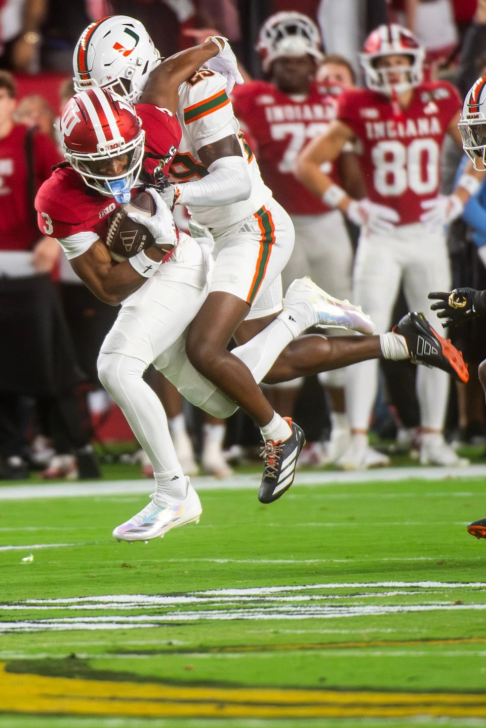 Indiana’s Omar Cooper Jr. (3) is tackled by Miami’s Romanas O.J. Frederique Jr. (29) during the College Football Playoff National Championship college football game at Hard Rock Stadium in Miami Gardens on Monday, Jan. 19, 2026.