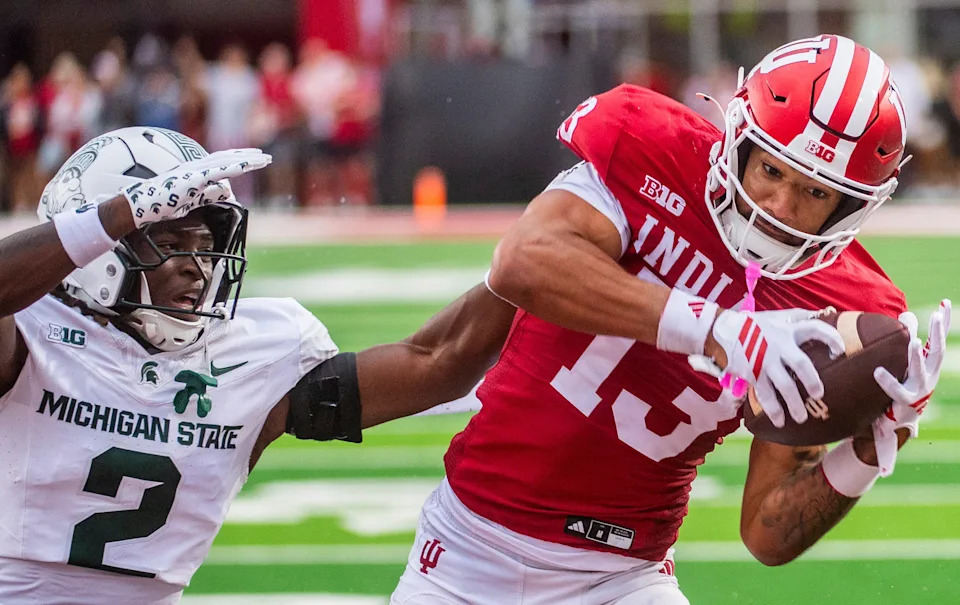 Indiana’s Elijah Sarratt (13) makes the catch during the Indiana versus Kennesaw State Big Ten football game at Memorial Stadium on Saturday, Sept. 6, 2025.