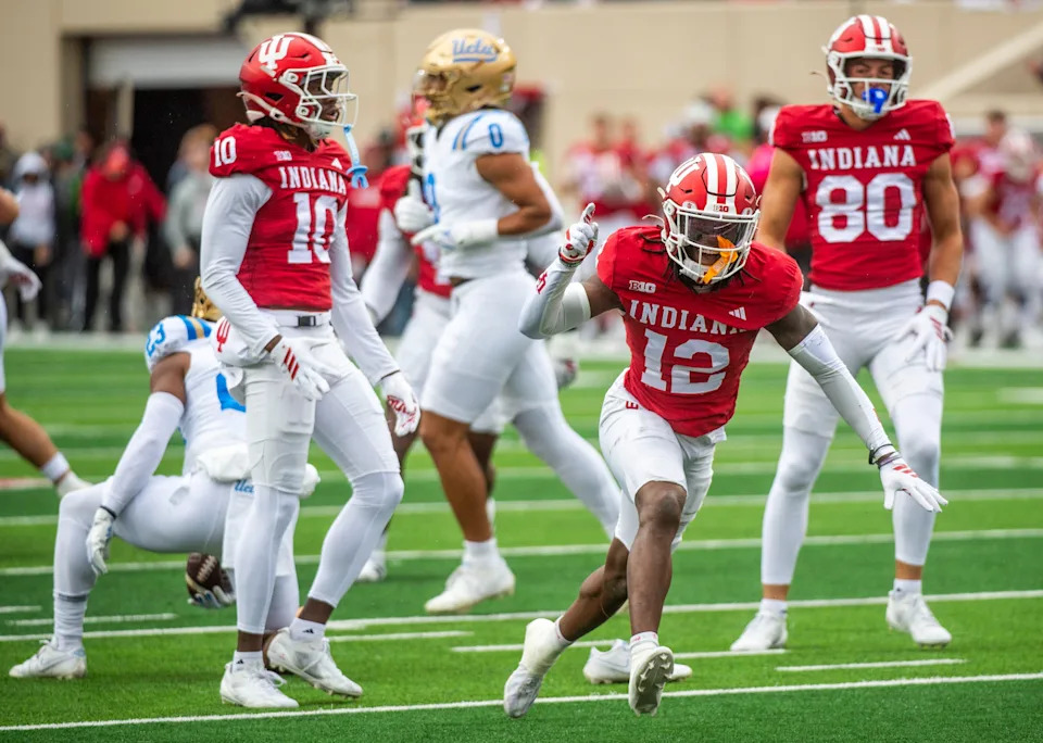 Indiana’s Devan Boykin (12) celebrates a tackle during the Indiana versus UCLA football game at Memorial Stadium on Saturday, Oct. 25, 2025.