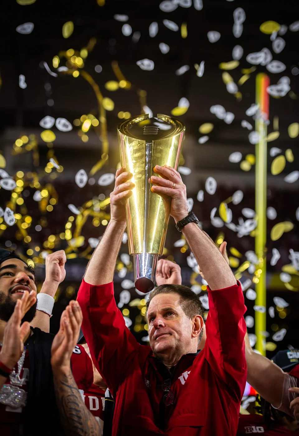 Indiana Head Coach Curt Cignett hoists the trophy after the College Football Playoff National Championship college football game at Hard Rock Stadium in Miami Gardens on Monday, Jan. 19, 2026.