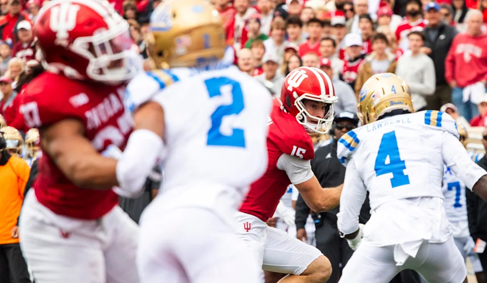 Indiana’s Fernando Mendoza (15) runs during the Indiana versus UCLA football game at Memorial Stadium on Saturday, Oct. 25, 2025.