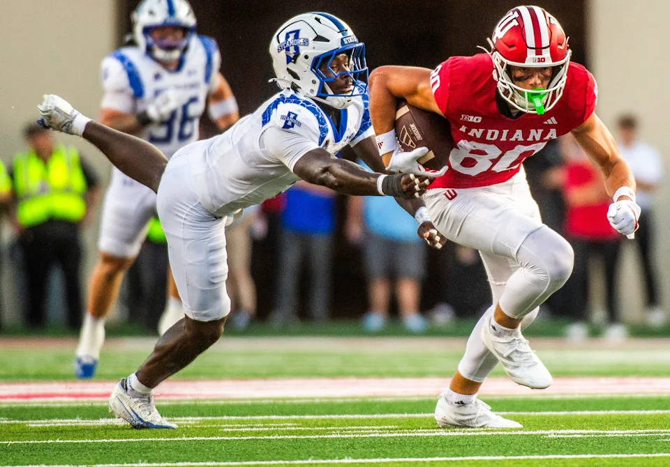 Indiana’s Charlie Becker (80) during the Indiana versus Indiana State football game at Memorial Stadium on Friday, Sept. 12, 2025.