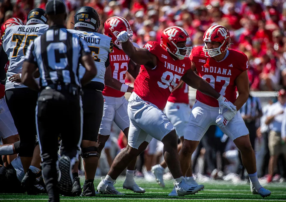 Indiana’s Mario Landino (97) celebrates his sack during the Indiana versus Old Dominion football game at Memorial Stadium on Saturday, Aug. 30, 2025.