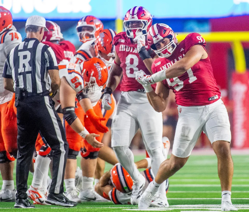 Indiana’s Kellen Wyatt (13)celebrates his sack during the Indiana versus Illinois football game at Memorial Stadium on Saturday, Sept. 20, 2025