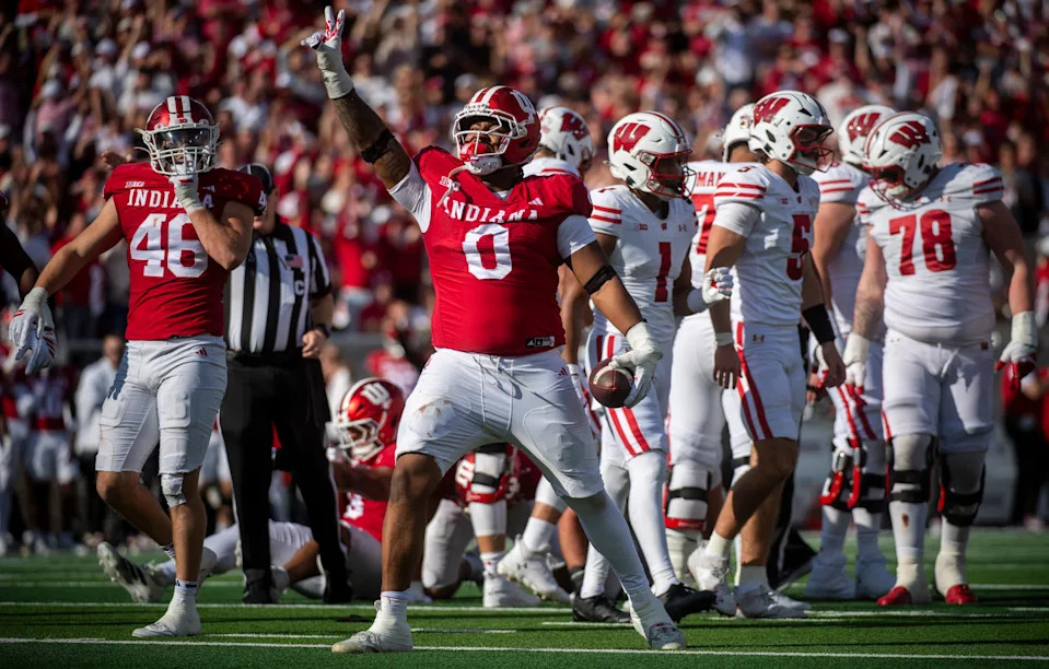 Indiana’s Hosea Wheeler (0) celebrates his fumble recovery during the Indiana versus Wisconsin football game at Memorial Stadium on Saturday, Nov. 15, 2025.