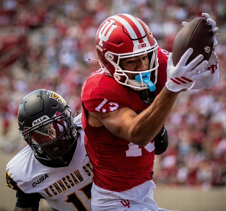 Indiana’s Elijah Sarratt (13) makes the catch for a touchdown during the Indiana versus Kennesaw State Big Ten football game at Memorial Stadium on Saturday, Sept. 6, 2025.