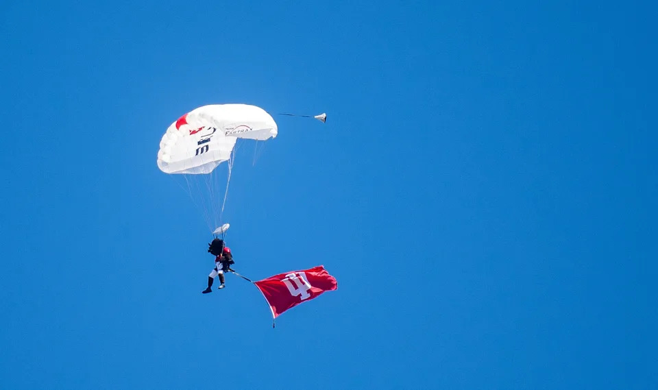 Hoosier the Bison decends to the field before the Indiana versus Old Dominion football game at Memorial Stadium on Saturday, Aug. 30, 2025.