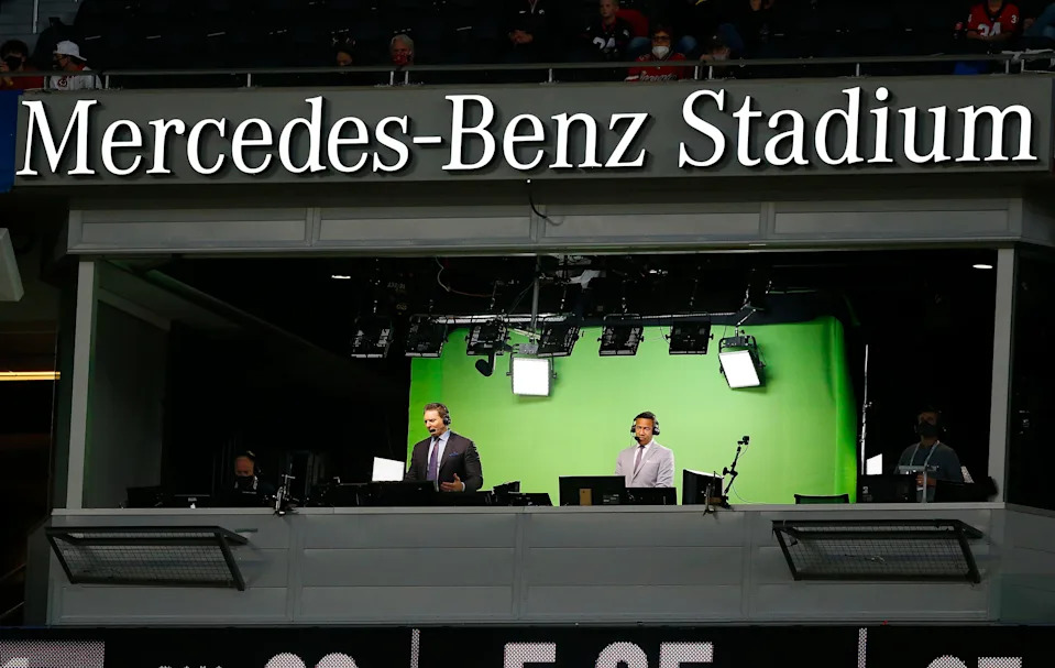 ATLANTA, GEORGIA – JANUARY 01: ESPN TV announcers Dusty Dvoracek (left) and Mark Jones call the Chick-fil-A Peach Bowl between the Georgia Bulldogs and the Cincinnati Bearcats at Mercedes-Benz Stadium on January 01, 2021 in Atlanta, Georgia. (Photo by Mike Zarrilli/Getty Images)
