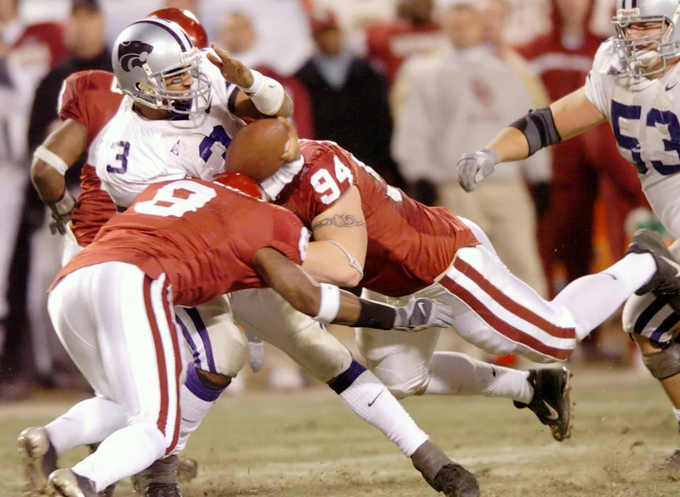 Kansas City, Mo. Saturday,12/06/2003 . BIG 12 CHAMPIONSHIP UNIVERSITY OF OKLAHOMA (OU) VS KANSAS STATE (KSU) COLLEGE FOOTBALL AT ARROWHEAD STADIUM. Sooners #8 Donte Nicholson & #94 Dusty Dvoracek hit Wildcats Ell Roberson to force a fumble late in the game. (Staff photo by Steve Gooch)
