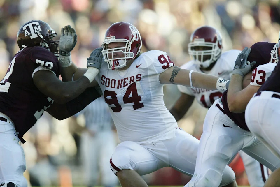 COLLEGE STATION, TX – NOVEMBER 9: Defensive lineman Dusty Dvoracek #94 of the University of Oklahoma Sooners stops outside linebacker Billy Yates #94 of the Texas A&M University Aggies during the game at Kyle Field on November 9, 2002 in College Station, Texas. Texas Tech won 49-24. (Photo by Ronald Martinez/Getty Images)