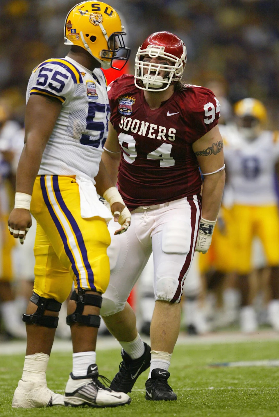 NEW ORLEANS – JANUARY 4: Defensive lineman Dusty Dvoracek #94 of the University of Oklahoma Sooners yells at center Ben Wilkerson #55 of the Louisiana State University Tigers during the National Championship Nokia Sugar Bowl at the Louisiana Superdome on January 4, 2004 in New Orleans, Louisiana. The LSU Tigers defeated the Oklahoma Sooners 21-14 to win the National Championship. (Photo by Jamie Squire/Getty Images)