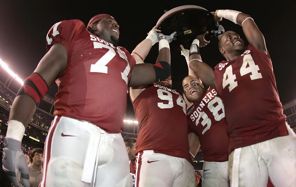 SAN DIEGO – DECEMBER 29: (L-R) Davin Joseph #77, Dusty Dvoracek #94, J.D. Runnels #38 and Clint Ingram #44 of the Oklahoma Sooners celebrate their 17-14 win over the Oregon Ducks with the winner’s trophy after the Pacific Life Holiday Bowl on December 29, 2005 at Qualcomm Stadium in San Diego, California. (Photo by Donald Miralle/Getty Images)