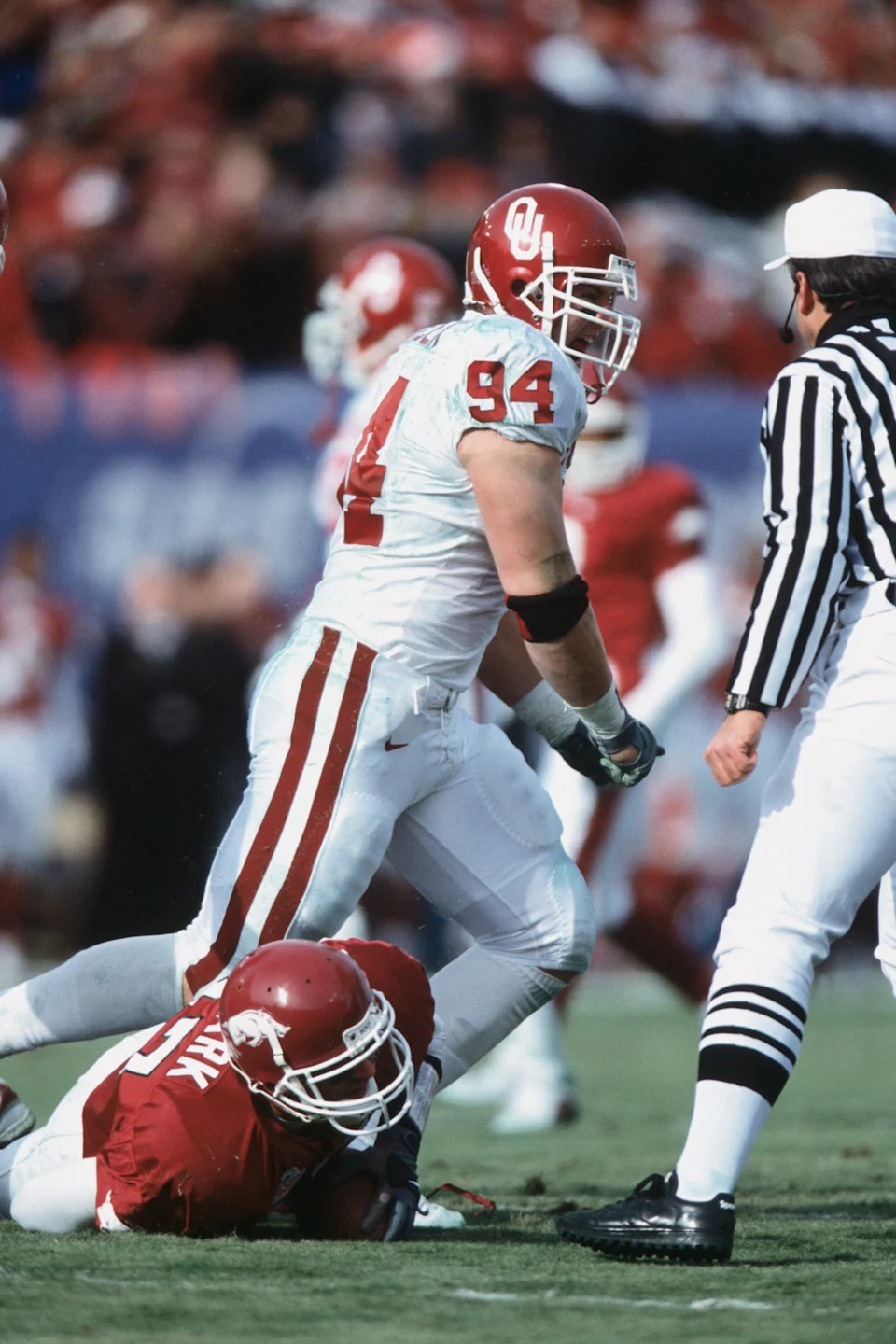 1 Jan 2002: Defensive end Dusty Dvoracek #94 of the Oklahoma Sooners runs during the NCAA game against the Akansas Razorbacks at the Cotton Bowl in Blacksburg, Virginia. Oklahoma defeated Arkansas 10-3. Mandatory Credit: Ronald Martinez/Getty Images