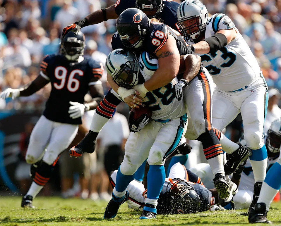 CHARLOTTE, NC – SEPTEMBER 14: Jonathan Stewart #28 of the Carolina Panthers tries to get past Dusty Dvoracek #98 of the Chicago Bears during their game at Bank of America Stadium on September 14, 2008 in Charlotte, North Carolina. (Photo by Streeter Lecka/Getty Images)