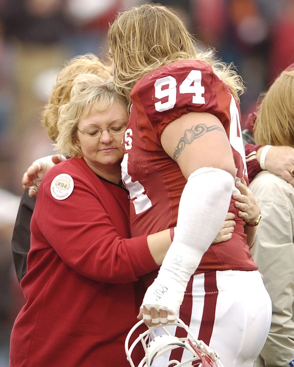 Sandra Dvoracek gives son Dusty a hug and he returns a kiss before the Oklahoma Sooners (OU) college football game against Oklahoma State University (OSU), at Gaylord Family-Memorial Stadium, Saturday, November 26, 2005, in Norman, Oklahoma. This is the 100th anniversary of the OU-OSU Bedlam game. by Steve Sisney/The Oklahoman