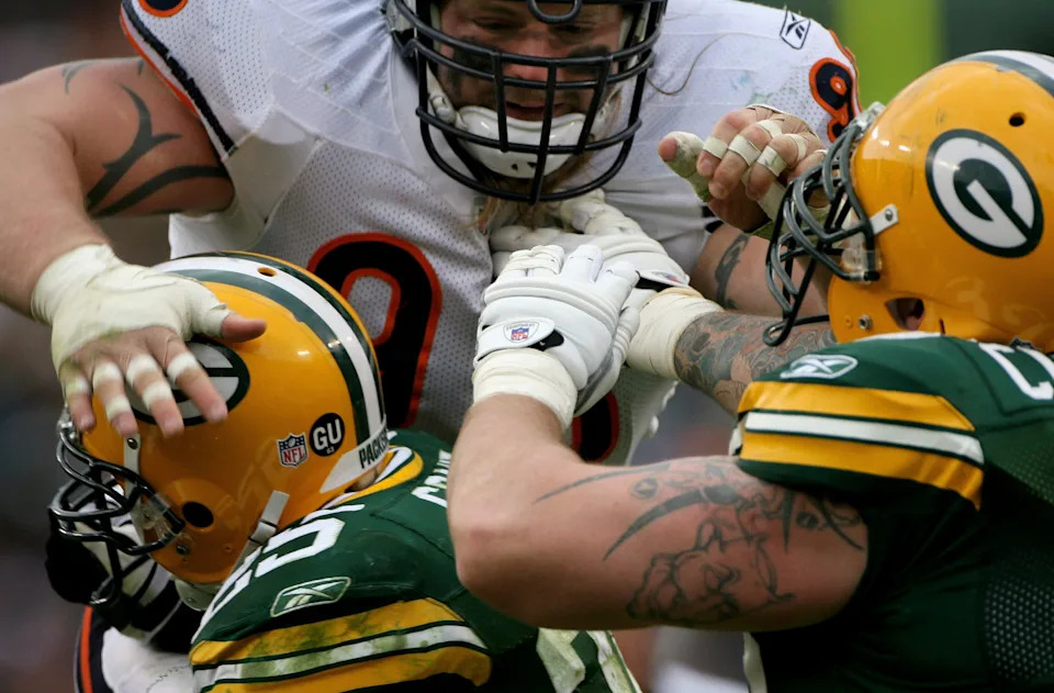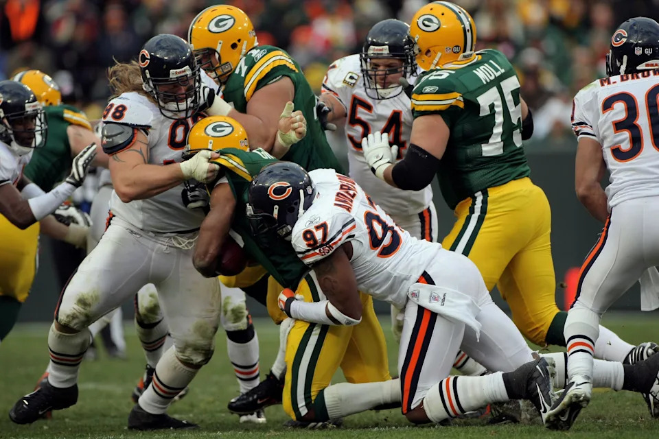 GREEN BAY, WI – NOVEMBER 16: Running back Ryan Grant #25 of the Green Bay Packers is tackled by defensive end Mark Anderson #97 and defensive tackle Dusty Dvoracek #98 of the Chicago Bears during NFL action at Lambeau Field on November 16, 2008 in Green Bay, Wisconsin. The Packers defeated the Bears 37-3. (Photo by Doug Pensinger/Getty Images)