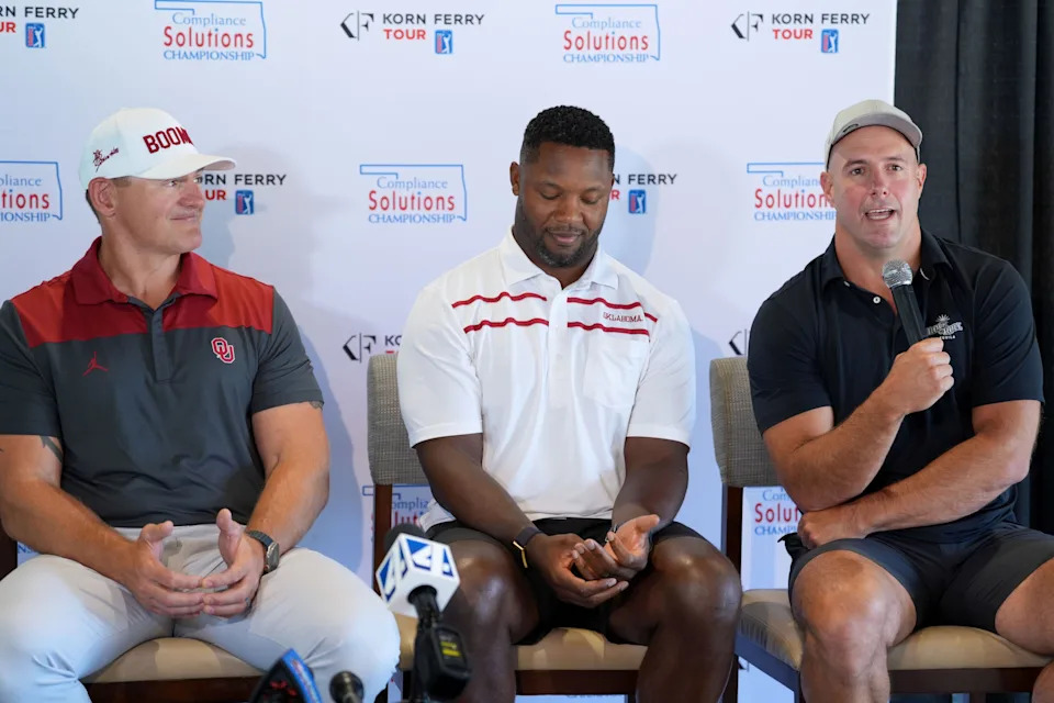 Dusty Dvoracek, left, Curtis Lofton and Teddy Lehman are interviewed during a press conference for a celebrity shootout charity event at the Compliance Solutions Championship golf tournament in Norman, Okla., Saturday, June 22, 2024.