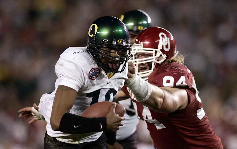 SAN DIEGO – DECEMBER 29: Quarterback Dennis Dixon #10 of the Oregon Ducks runs with the ball against the tackle of Dusty Dvoracek #94 of the Oklahoma Sooners during the first half of the Pacific Life Holiday Bowl on December 29, 2005 at Qualcomm Stadium in San Diego, California. (Photo by Donald Miralle/Getty Images)