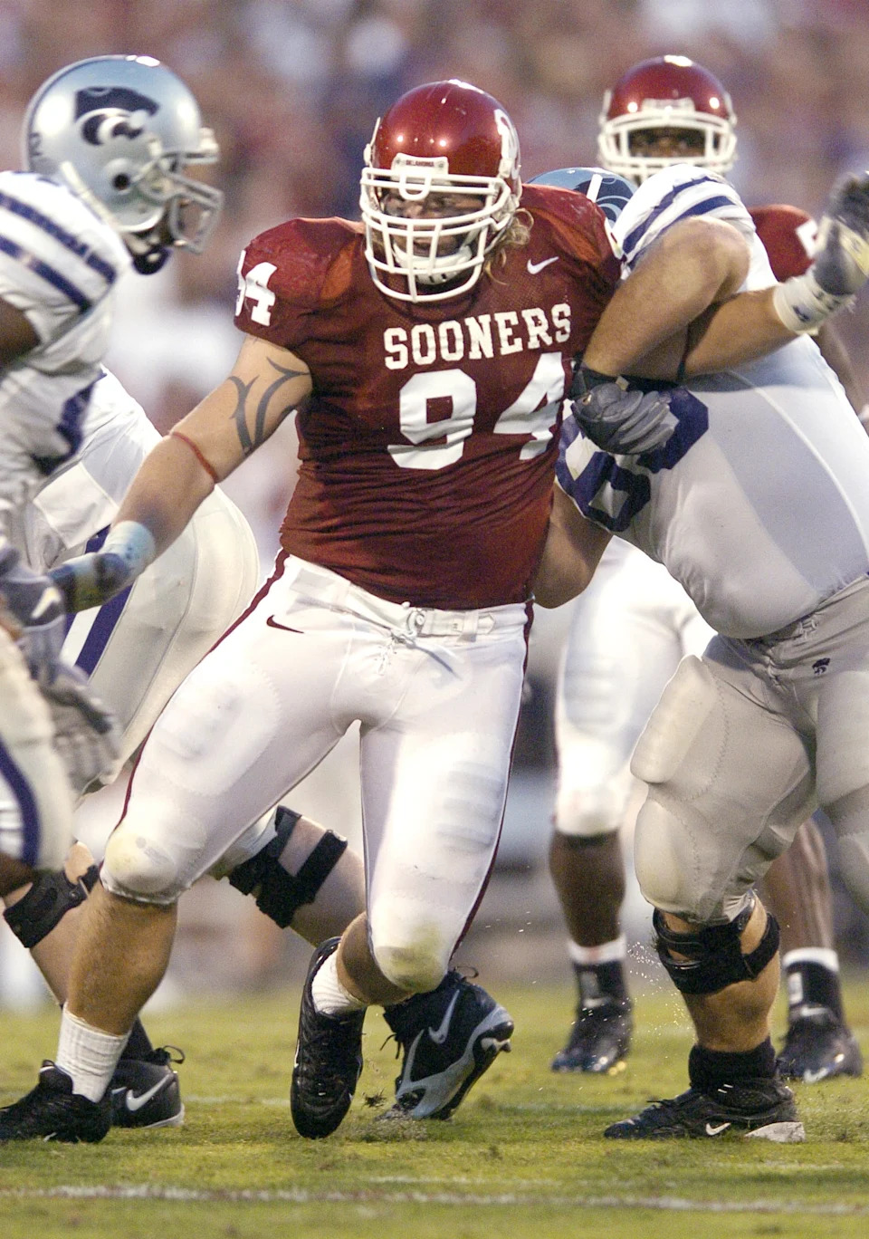 Oklahoma’s Dusty Dvoracek fights off a block during the Oklahoma Sooners (OU) college football game against the Kansas State Wildcats (KSU) at Gaylord Family-Oklahoma Memorial Stadium in Norman, Okla., October 1, 2005. By Steve Sisney/The Oklahoman