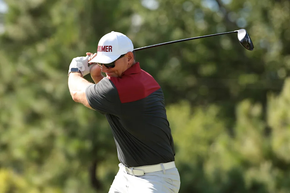 NORMAN, OKLAHOMA – JUNE 22: Former football player Dusty Dvoracek hits a tee shot on the tenth hole during a celebrity shootout after the third round of the Compliance Solutions Championship at Jimmie Austin OU Golf Club on June 22, 2024 in Norman, Oklahoma. (Photo by Andrew Wevers/Getty Images)