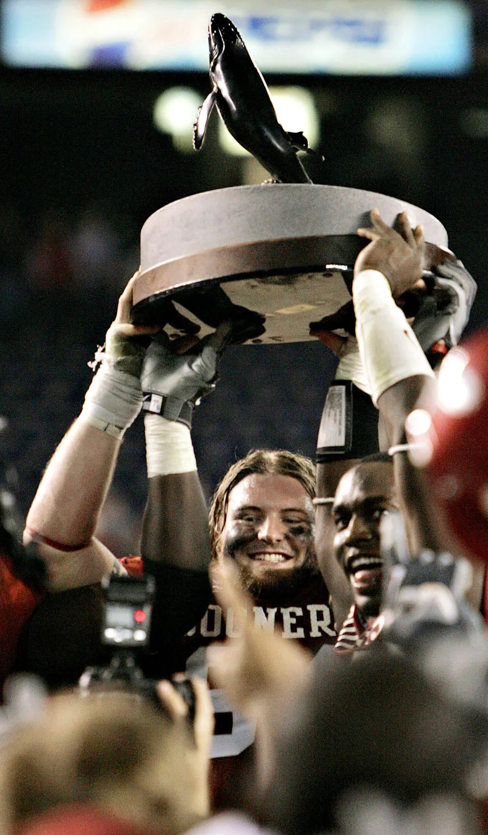 Dusty Dvoracek holds up the Holiday Bowl trophy after the Oklahoma Sooners (OU) beat the Oregon Ducks in the Pacific Life Holiday Bowl college football game at Qualcomm Stadium in San Diego, Calif., Thursday, December 29, 2005. By Bryan Terry, The Oklahoman.