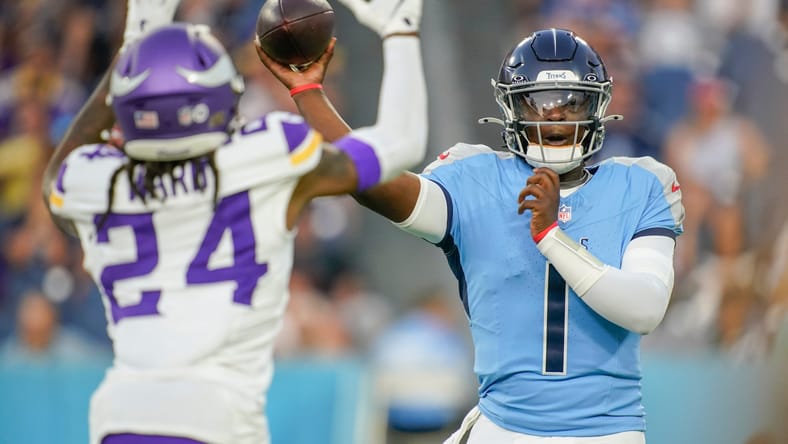 Tennessee Titans quarterback Cam Ward (1) throws the ball under pressure from Minnesota Vikings safety Jay Ward (24) during the first quarter of an NFL pre-season game at Nissan Stadium in Nashville, Tenn., Friday, Aug. 22, 2025.