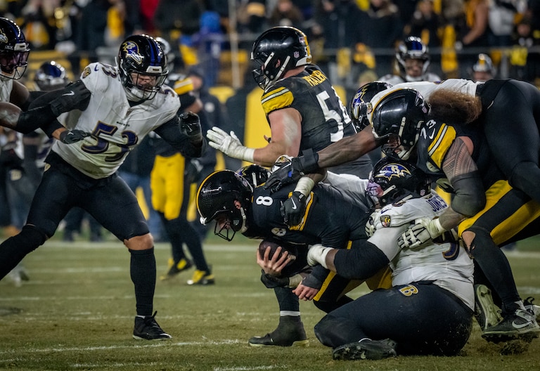 Defensive lineSteelers quarterback Aaron Rodgers (8) is tackled by Ravens defensive tackle Travis Jones (98) after a short gain in Week 18. (Jerry Jackson/The Banner)