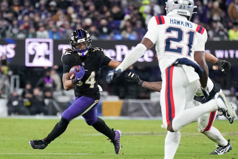 Former Ravens running back Keaton Mitchell rushes forward in the third quarter against the New England Patriots in Week 16. (Ulysses Muñoz/The Banner)