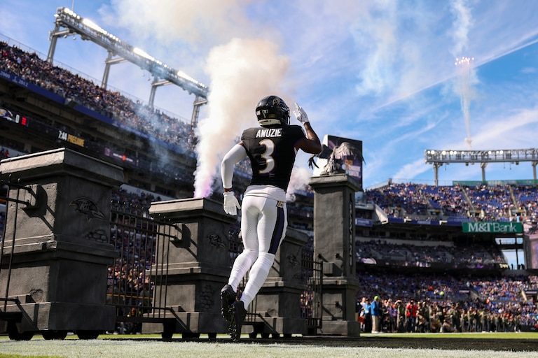 CornerbackRavens cornerback Chidobe Awuzie runs out of the tunnel ahead of the team’s Week 8 game against the Chicago Bears. (Heather Diehl for The Banner)