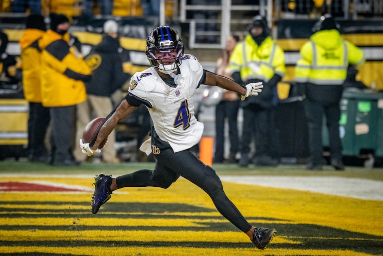 No changeWide receiverRavens wide receiver Zay Flowers runs into the end zone for his second fourth-quarter touchdown against the Pittsburgh Steelers in Week 18. (Jerry Jackson/The Banner)