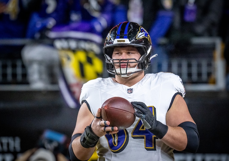 Offensive lineFormer Ravens center Tyler Linderbaum warms up as the team prepares for its Week 18 game against the Pittsburgh Steelers. (Jerry Jackson/The Banner)