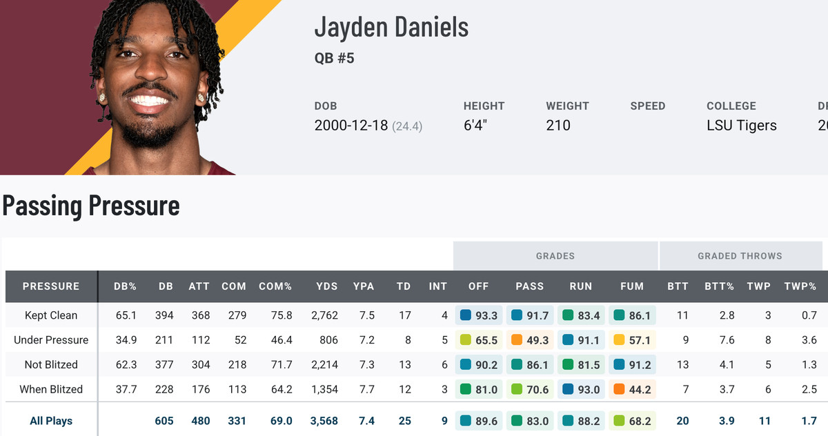 The other new wrinkle, this on the Giants’ side, is whether a very quick edge defender like Abdul Carter can disrupt Daniels’ passing game. Daniels was clearly affected by pressure as a rookie, though no more than most QBs: