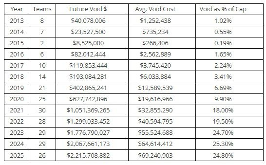 Things dramatically changed in 2021 due to Covid. 30 teams now had a contract with at least one void year and the average league cost was nearly 20% of the cap that year. In the last three year, long after the real impact of the Covid year we are around 25%.