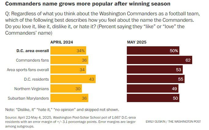 What’s more: Half of all D.C.-area adults now “like” or “love” the team’s name, which was changed in 2022 and became a hot-button issue for many fans who either clamored for a return to the franchise’s previous name, Redskins, or sought an alternative. In 2024, only 34 percent liked or loved the new name.
