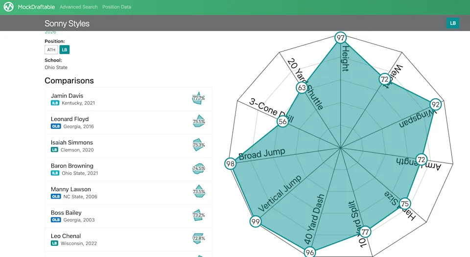 The thing that stood out to me the most about Styles as a player is his intelligence. This guy can diagnose a play quickly, react to it, has the athleticism and closing speed to get to the areas he needs to get to, and blow up plays at will. He can make the switch from coverage to downhill pursuit quickly, often being the first player in the second level to diagnose a play and close in on the runner. His pre-snap pay recognition is impeccable. Meanwhile, his pure size and strength makes him a nightmare for potential blockers. To put it in context, Eagles EDGE Nolan Smith is 3 inches shorter and 7 pounds lighter than Styles. He has no problem matching up physically with offensive linemen as a result, although he still could use some refinement closer to the line partially due to still being new to the position.